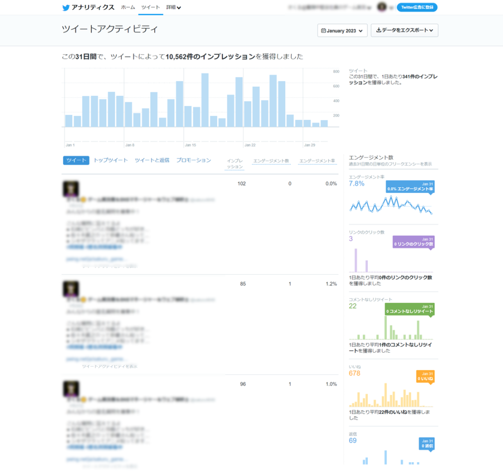 レポート作成するときは、このぺーじで実績の良かったツイートや悪かったツイートを見つけ、何が良かったのか・何が悪かったのかという原因を調査します。